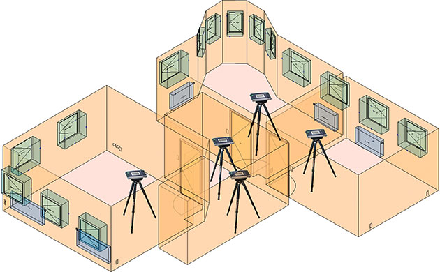 – Błyskawiczna dokumentacja konturów ścian w pomieszczeniu W oprogramowaniu pomiarowym tworzona jest trójwymiarowa przestrzeń. Do jej zdefiniowania wystarczy zaledwie kilka punktów pomiarowych: dokładnie dwa punkty na każdą płaszczyznę ściany oraz po jednym punkcie na podłogę i sufit.